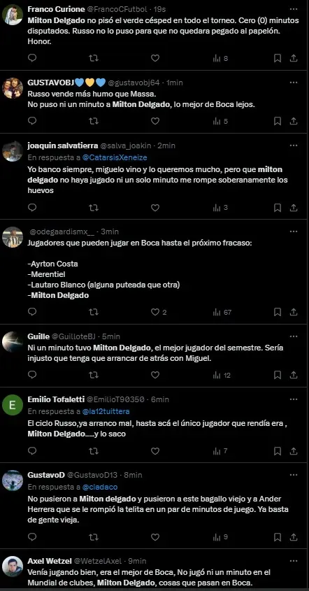 A su vez, los fanáticos se quejaron por la ausencia de Milton Delgado en el 11 inicial. “No tuvo ni un minuto“, “Inexplicable“, “Qué injusta es la vida“, “Era el único que rendía y lo sacó“, “No se entiende por qué no juega“, fueron algunos comentarios en redes sobre la elección de Miguel Ángel Russo de no ponerlo en todo el torneo.