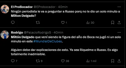 A su vez, los fanáticos se quejaron por la ausencia de Milton Delgado en el 11 inicial. “No tuvo ni un minuto“, “Inexplicable“, “Qué injusta es la vida“, “Era el único que rendía y lo sacó“, “No se entiende por qué no juega“, fueron algunos comentarios en redes sobre la elección de Miguel Ángel Russo de no ponerlo en todo el torneo.