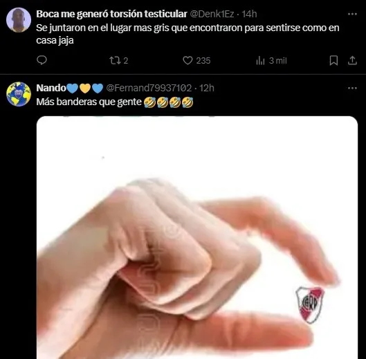 Y es que, mientras que el Xeneize copó toda una playa en Miami, los hinchas de River apenas juntaron una pequeña cantidad de personas a las afueras del hotel en donde se hospedan sus jugadores en Seattle. Y con esto, los de Boca no aguantaron la risa: “No llegan a 50″, “Más banderas que gente”, y “Un baby shower”.