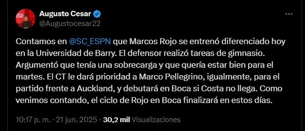 A lo que la fuente agregó la postura del DT respecto a la situación de Rojo: “El CT le dará prioridad a Marco Pellegrino, igualmente, para el partido frente a Auckland, y debutará en Boca si Costa no llega. Como venimos contando, el ciclo de Rojo en Boca finalizará en estos días“.