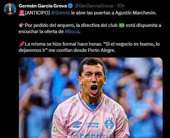 A su vez, se dio a conocer la postura del club de Porto Alegre. Según reveló el periodista Germán García Grova, el Gremio está dispuesta a escuchar la oferta de Boca. Todo esto, por pedido del arquero y sus ganas de jugar en el cuadro argentino.