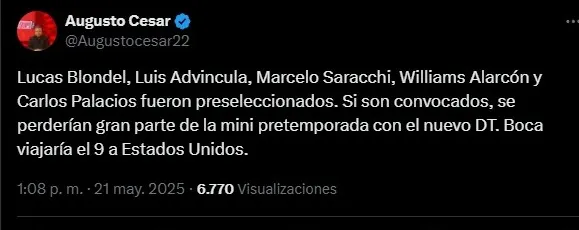 Hay 5 jugadores de Boca que tienen chances de sumarse más tarde al viaje de Boca a los Estados Unidos para el Mundial de Clubes el 9 de junio. Y de ser el caso, estos tendrán menos días de trabajo con quien llegue como DT del equipo Xeneize.