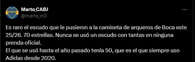 Quien se dio cuenta de esto fue el tuitero hincha de Boca “Marto_CABJ“, reconocido por subir información sobre la indumentaria del Xeneize. Y en este caso, él contó las estrellas que tenía el escudo en la camiseta de Agustín Marchesín. Y en vez de tener 50, ¡tenía nada menos que 72! Algo Inédito.