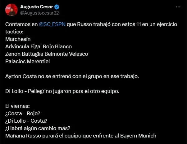 Sin embargo, Miguel Ángel Russo sorprendió en la práctica del miércoles por la tarde. Ya que Marcos Rojo apareció dentro del equipo titular y se generó la duda de si podría tener un lugar por encima de Di Lollo, junto a Ayrton Costa frente a Benfica a pesar de ser los dos zurdos.