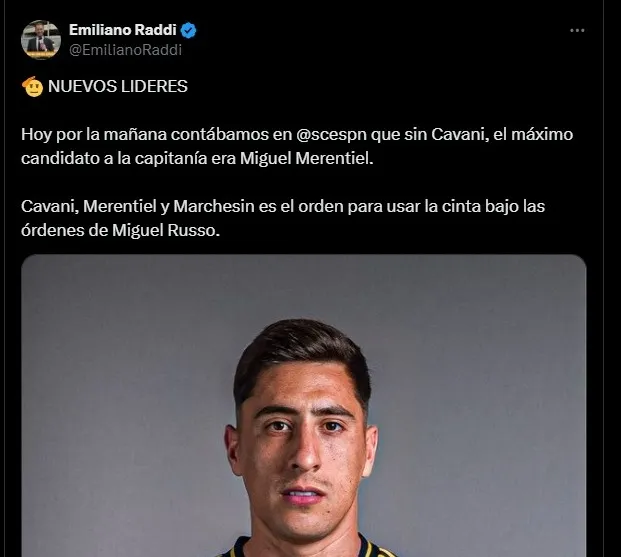 En caso de no estar disponible Cavani, quien será el capitán de Boca es Miguel Merentiel. Situación que ya se repitió en el partido contra Benfica en el Mundial de Clubes. Y si la Bestia ni el Matador están, el tercer capitán ahora es Agustín Marchesín.