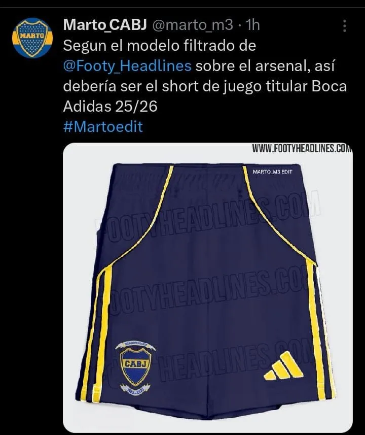 Hace unos días, la reconocida página web “Footy Headlines” filtró lo que sería el nuevo short del Arsenal de Inglaterra. Y, siguiendo la línea del modelo del equipo inglés, el usuario de Twitter @marco_m3 realizó una predicción de lo que podría ser el nuevo short de Boca.
