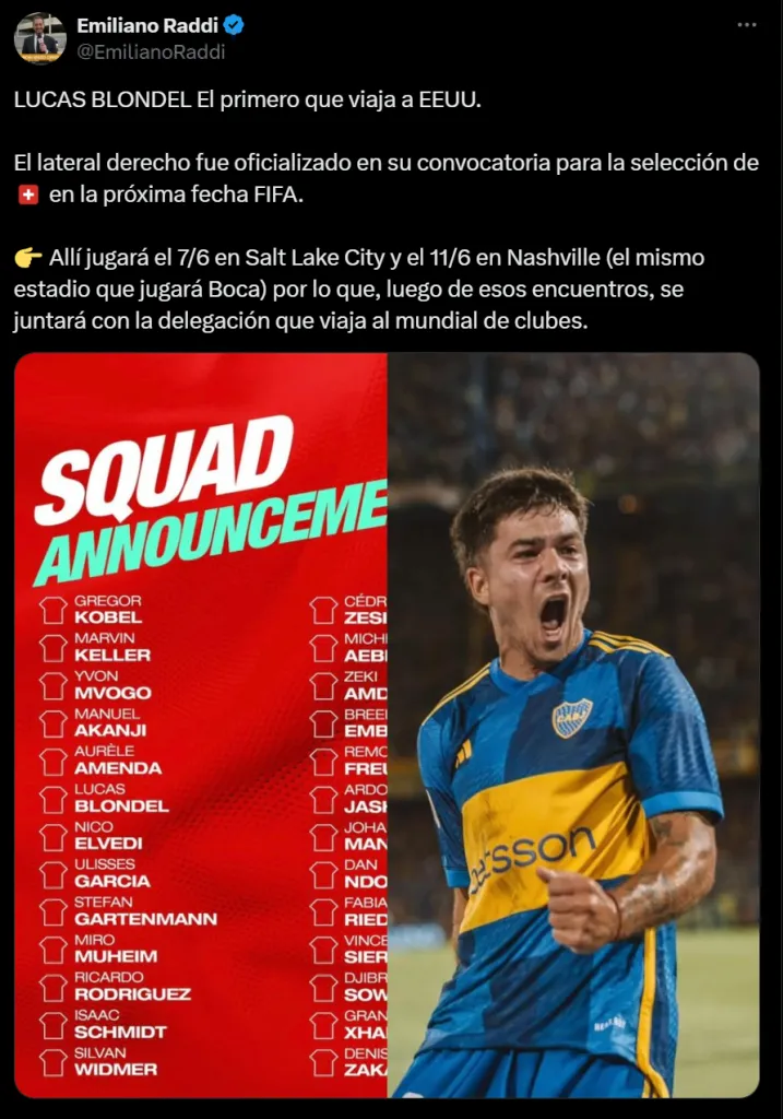 El lateral estará viajando con la Selección de Suiza, que disputará dos amistosos en Estados Unidos, tal como averiguó el periodista Emiliano Raddi de Planeta Boca Juniors. El DT del seleccionado europeo volvió a citar al jugador Xeneize, luego de su debut en 2024 ante Luxemburgo e Irlanda del Norte.