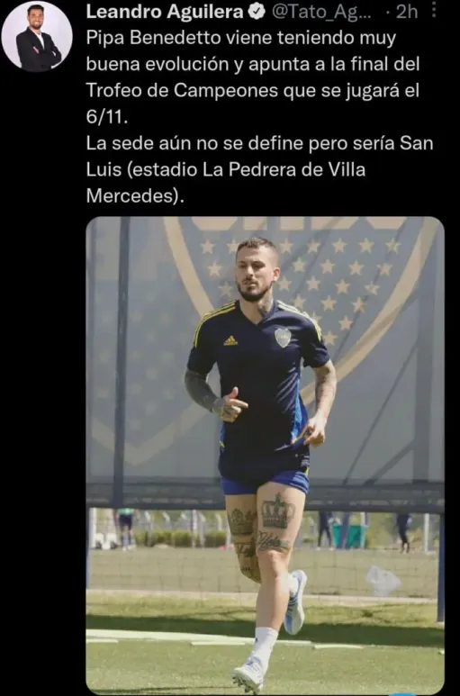A nueve días de su lesión, Benedetto todavía se ilusiona con estar en la final del Trofeo de Campeones (06/11, con sede a confirmar). En la mañana de este sábado, el periodista Leandro “Tato” Aguilera informó: “Pipa Benedetto viene teniendo muy buena evolución y apunta a la final del Trofeo de Campeones”.