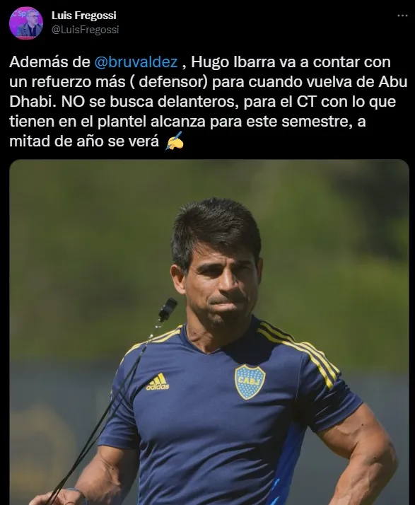 El periodista Luis Fregossi habló de este tema: “Además de Bruno Valdez, Hugo Ibarra va a contar con un refuerzo más (defensor) para cuando vuelva de Abu Dhabi. No se buscan delanteros, para el cuerpo técnico con lo que tienen en el plantel alcanza para este semestre, a mitad de año se verá”.