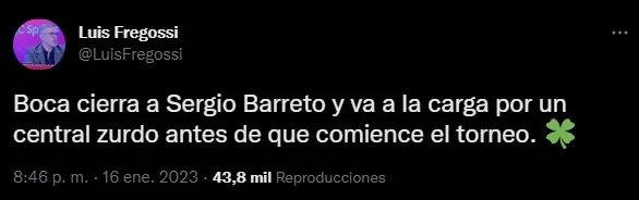 Pero, además, el cronista aseguró: “Boca cierra a Sergio Barreto y va a la carga por un central zurdo antes de que comience el torneo“. Todo indica que en los próximos días puede haber acuerdo con Independiente para sumar a Barreto, pero además se buscará un tercer defensor.