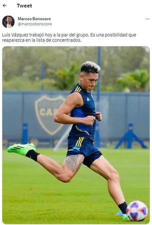 Su última aparición oficial fue el 6 de noviembre en el Trofeo de Campeones ante Racing. Según el periodista Marcos Bonocore “es una posibilidad que reaparezca en la lista de concentrados“. Vázquez podría integrar el banco de suplentes y el punta sería Miguel Merentiel. Con Darío Benedetto aún sancionado y Nicolás Orsini lesionado, el DT gana una buena alternativa.