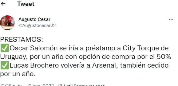 “Oscar Salomón se iría a préstamo a City Torque de Uruguay, por un año con opción de compra por el 50%”, destacó el periodista. El Montevideo City Torque es la representación en Sudamérica del City Football Group, dueño también del Manchester City, New York City, Girona, Bolivar y Melbourn City. Sin dudas, una gran vidriera para Salomón. ¿La aprovechará?