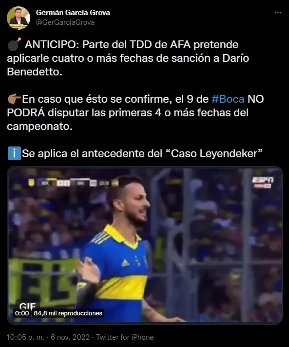 Sin embargo, distinto podría ser lo de Benedetto, que por sus gestos quedó expuesto y podría recibir un castigo mucho más fuerte. “Parte del Tribunal de Disciplina de AFA pretende aplicarle cuatro o más fechas de sanción a Darío Benedetto. En caso que ésto se confirme, el 9 de Boca NO PODRÁ disputar las primeras 4 o más fechas del campeonato. Se aplica el antecedente del ‘Caso Leyendeker'”, aseguró Grova.