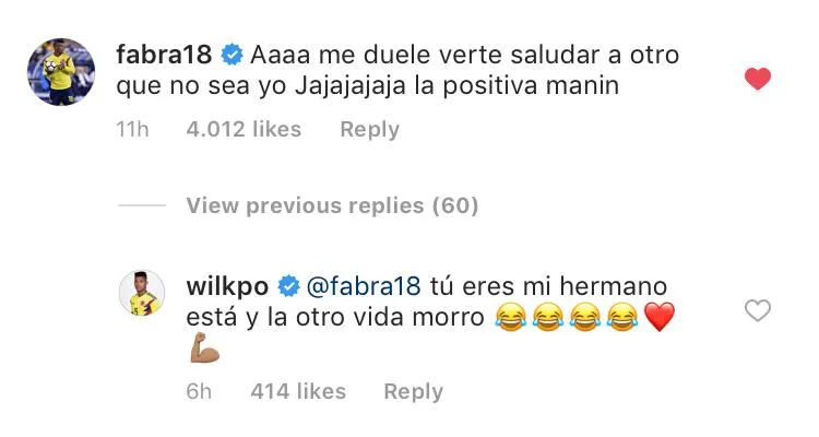 El lateral comentó la foto que publicó el volante entrenando en el Zenit de Rusia. “Me duele verte saludar a otro que no sea yo jajaja”, le dijo, obviamente en chiste. “Tú eres mi hermano en esta y la otra vida, morro”, le respondió Wilmar.