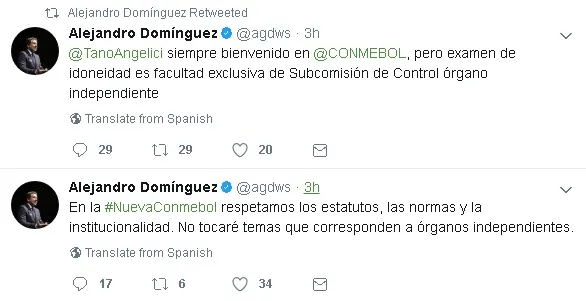 Pero la respuesta de la Conferación Sudamericana llegó y fue firme. Alejandro Domínguez su presidente, le respondió a Angelici a través de Twitter.