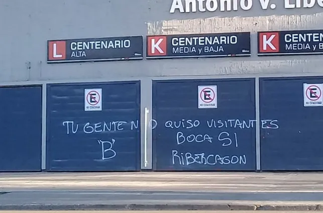 Esta mañana, el Monumental amaneció con una pintada. Un periodista partidario riverplatense publicó las imágenes. El mensaje: “Tu gente no quiso visitantes, Boca sí, Riber cagón, ‘B'”.