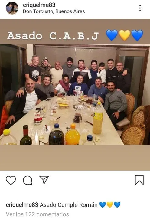 Y fue con un asado bien bostero. Es que Román armó una cena en su casa con varios excompañeros de Boca.