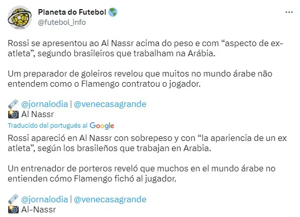 Recientemente, el periodista el periodista Venê Casagrande y el medio Jornal O Dia “Rossi apareció en Al Nassr con sobrepeso y con ‘la apariencia de un ex atleta’, según los brasileños que trabajan en Arabia. Un entrenador de porteros reveló que muchos en el mundo árabe no entienden cómo Flamengo fichó al jugador”.