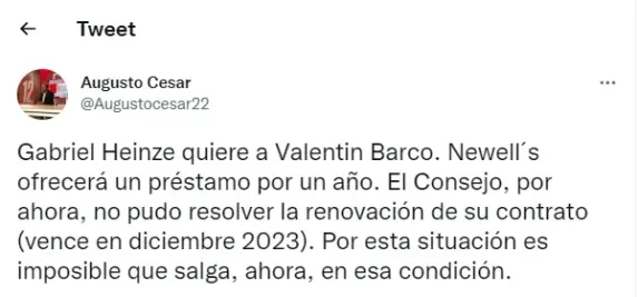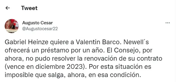 Según informó el periodista Augusto César, el conjunto rosarino “ofrecerá un préstamo por un año”. Pero, el único inconveniente sería la situación contractual del joven lateral izquierdo. El vínculo del “Colo” con el “Xeneize” lo une hasta diciembre de 2023 y hasta el momento, el Consejo de Fútbol no pudo resolver su renovación.