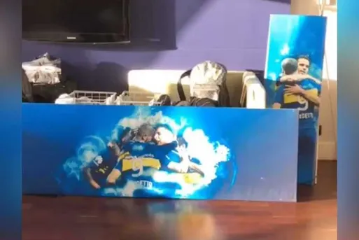 Se trata de dos banners que había en el pasillo con fotos que lo tienen como protagonista. Primero, una de un abrazo grupal. Luego, una suya junto a Fernando Gago.