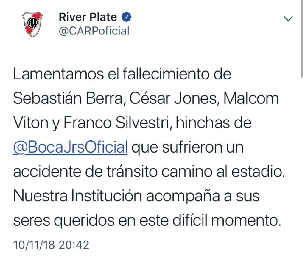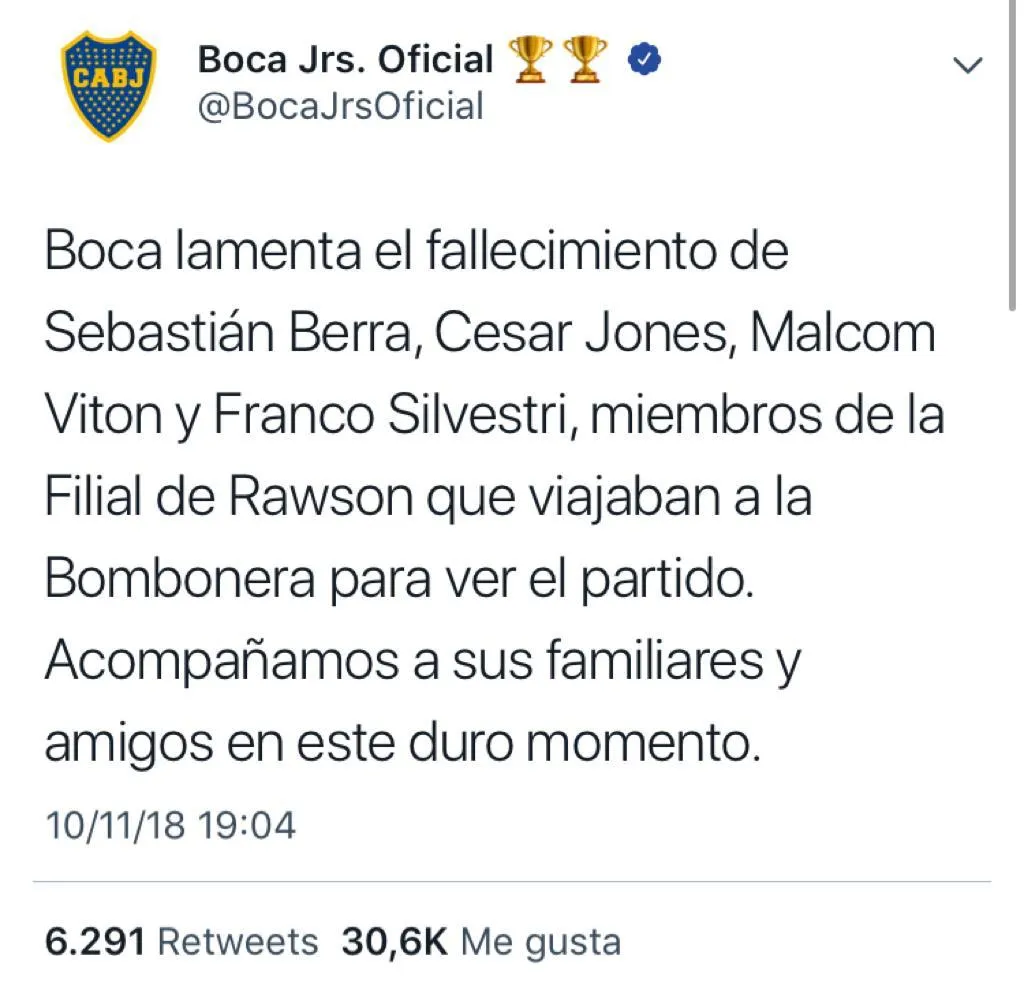 Rodolfo Ferrari, vicepresidente del club, lamentó la noticia en Fox Sports: “La verdad que no hay palabras para transmitir el dolor que sentimos todos por lo que ocurrió con los chicos de la peña de Trelew. Conocía a uno de ellos, hijo del presidente de la peña, la noticia me partió al medio”.