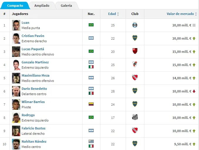 Entre los jugadores, Cristian Pavón es el más valioso del plantel de Boca, con 20 millones (aunque su cláusula de rescisión sea de 50 millones de dólares). Lo mismo que Luan, el brasileño de Gremio, que ocupa el primer lugar general (Kichan es el segundo). Después de Cristian, en la tabla de Boca figuran Darío Benedetto y Wilmar Barrios, con 10 millones de euros cada uno (en la lista total, 6° y 7°).