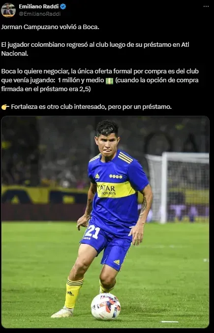 Según informó el periodista Emiliano Raddi para Planeta Boca, Jorman Campuzano regresó al Xeneize después de lo que fue su préstamo en Atlético Nacional.