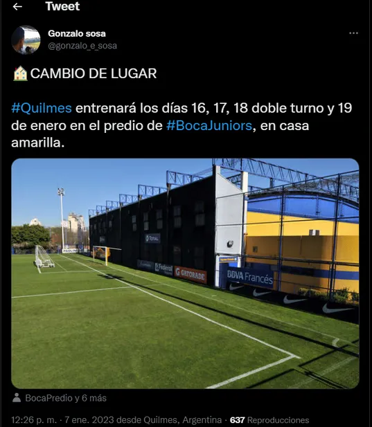 El periodista Gonzalo Sosa confirmó que “Quilmes entrenará los días 16, 17, 18 doble turno y 19 de enero en el predio de Boca Juniors, en Casa Amarilla“.