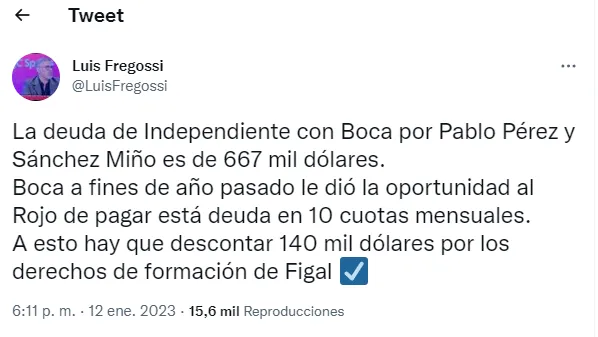 Entre los clubes hay buena relación. Y al Xeneize hay un factor que le juega a favor: las deudas acumuladas del Rojo. Según reveló el periodista Luis Fregossi, el equipo de Avellaneda debe 667 mil dólares por los pases de Pablo Pérez y Juan Sánchez Miño. “A esto hay que descontar 140 mil dólares por los derechos de formación de Figal”, aclaró el cronista.