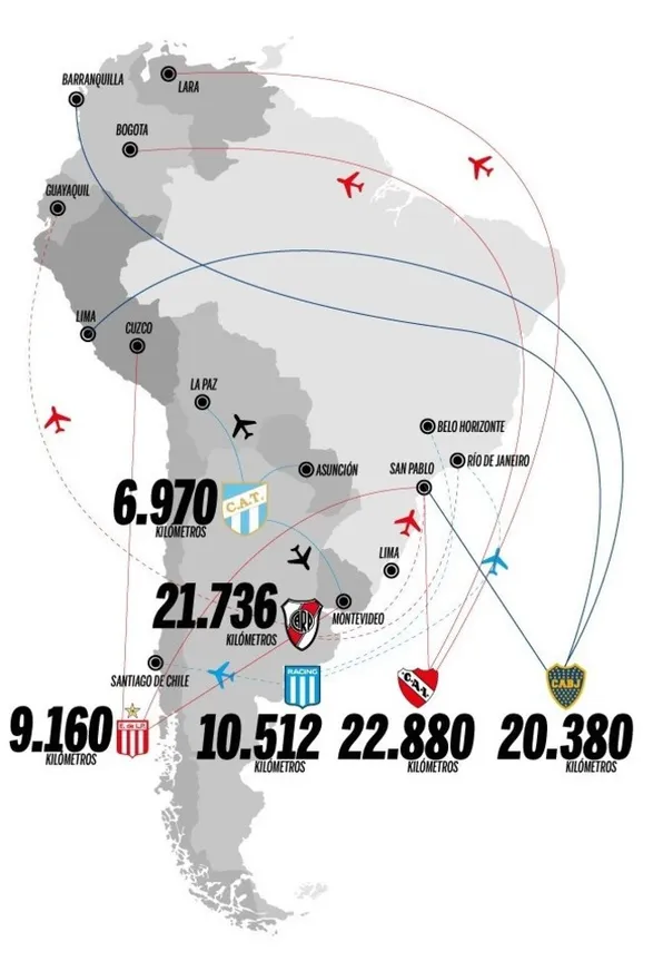Sólo Independiente (22 mil) y River (21 mil) superan la cantidad de kilómetros que hará Boca. Por detrás vienen Racing (10 mil), Estudiantes (9 mil) y Atlético Tucumán (6 mil).