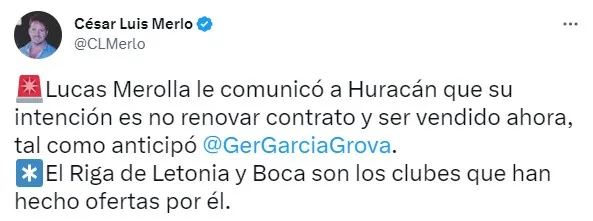 Según indicó el periodista Germán García Grova, “Lucas Merolla le comunicó a Huracán que su intención es no renovar contrato y ser vendido ahora. El Riga de Letonia y Boca son los clubes que han hecho ofertas por él”.