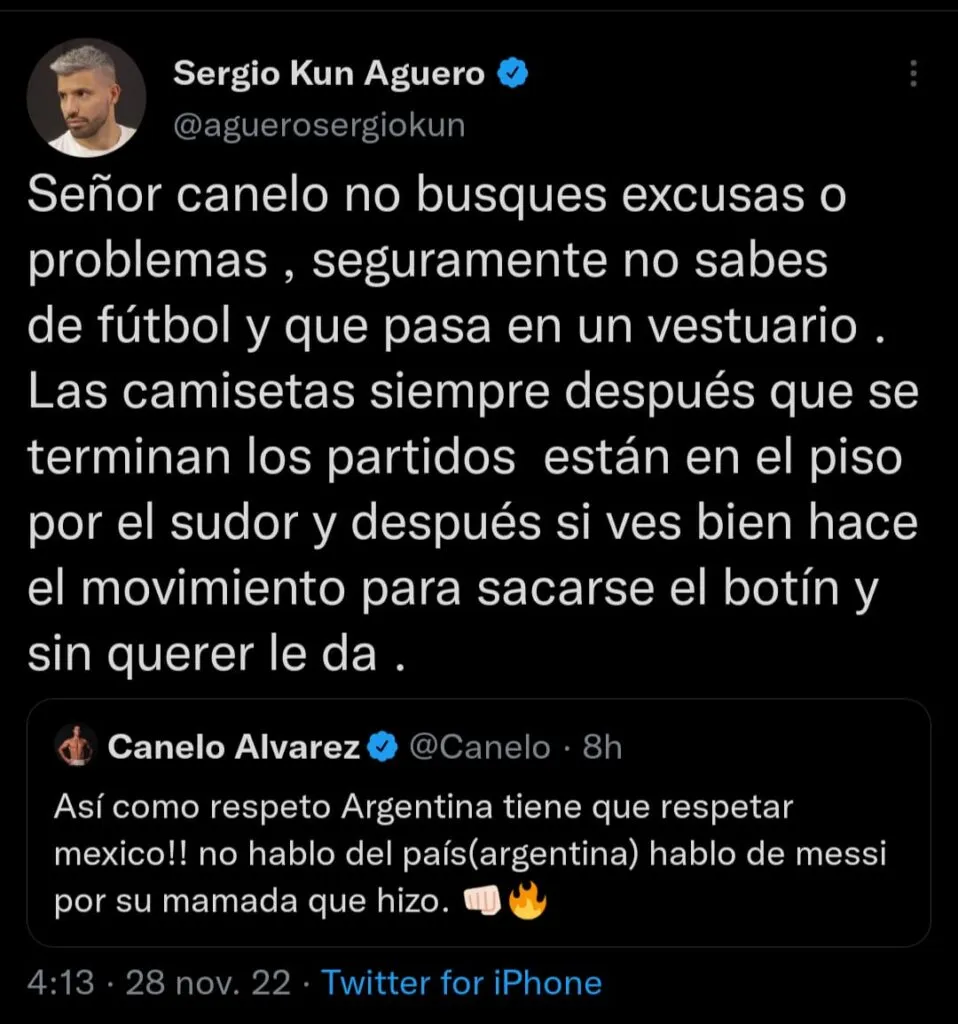 El Kun Agüero, exjugador de la Selección Argentina y gran amigo de Messi, salió a defender al capitán del combinado nacional. “Señor Canelo, no busques excusas o problemas. Seguramente no sabés de fútbol y qué pasa en un vestuario. Las camisetas siempre después que se terminan los partidos están en el piso por el sudor. Y después, si ves bien, hace el movimiento para sacarse el botín y sin querer le da”, sostuvo.