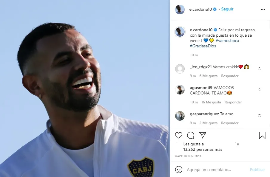 Pero este miércoles, el colombiano se sumó al trabajo en el Centro de Entrenamiento de Ezeiza. Y lo anunció en su cuenta oficial de Instagram. “Feliz por mi regreso, ¡con la mirada puesta en lo que se viene! #vamosboca #GraciasaDios”, escribió el volante.