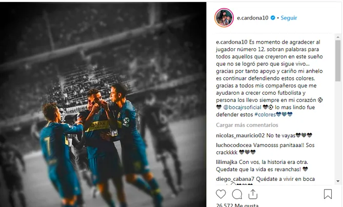 Edwin Cardona quedó afuera del banco de suplentes en ambas finales frente a River. Sin embargo, el colombiano no guarda rencor y, a través de un comunicado en su cuenta de Instagram, agradeció el apoyo de los hinchas, aseguró que el sueño de conquistar América no murió y se refirió a su futuro.