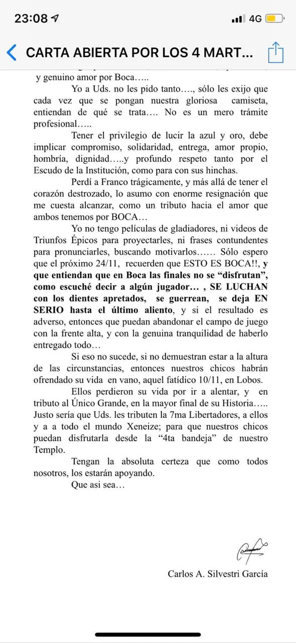 Carlos Silvestri, presidente de la peña de Trelew, y padre de Franco Silvestri, uno de los hinchas fallecidos trágicamente en un choque en Lobos mientras viajaban para ver la ida de la final, aportó sus palabras. Carlos se animó y escribió una carta abierta emocionante para el plantel y que vale la pena compartir.
