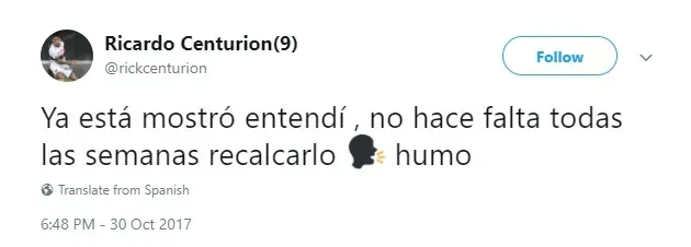 La pasada semana, Daniel Angelici habló sobre la posibilidad de que Ricardo Centurión vuelva a vestir la camiseta de Boca Juniors. Si bien el jugador mostró ganas, el presidente fue tajante y directo: “Mientras yo esté al frente del club, no hay ninguna chance que vuelva”.
