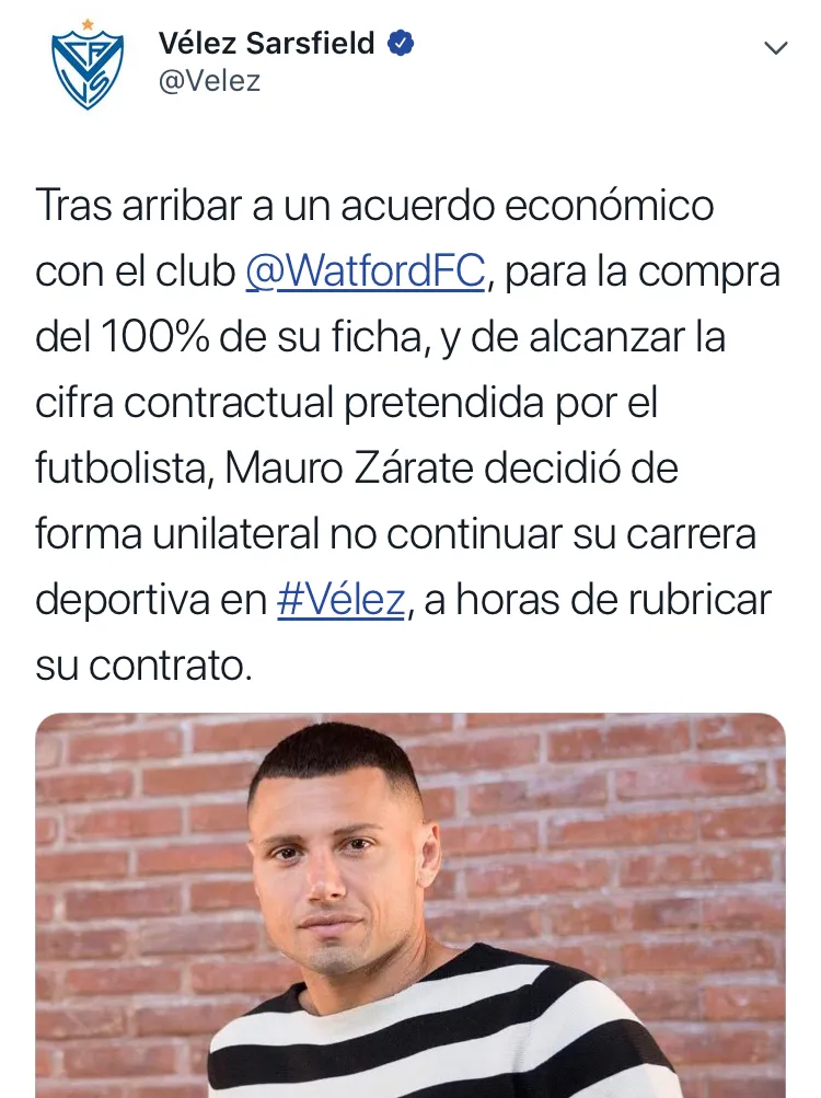 “Tras arribar a un acuerdo económico con el club Watford, para la compra del 100% de su ficha, y de alcanzar la cifra contractual pretendida por el futbolista, Mauro Zárate decidió de forma unilateral no continuar su carrera deportiva en Vélez, a horas de rubricar su contrato”.