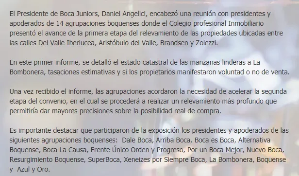 En el día de ayer, Daniel Angelici encabezó una reunión con presidentes y apoderados de 14 agrupaciones boquenses para hablar sobre La Bombonera. Recordemos que, durante la semana, el presidente contó que el Colegio Público Inmobiliario realizó un nuevo relevamiento de las dos manzanas para intentar ampliar el estadio.