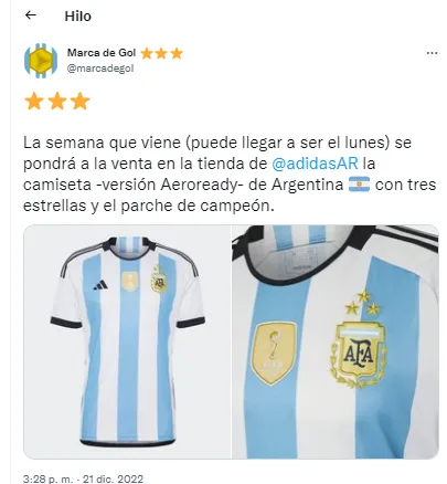 La AFA soprendió poniendo la nueva estrella por encima de las dos anteriores (1978) y (1986) en la camiseta de festejos. Sin embargo, tanto en la cuenta oficial de AFA como en la de la Selección Argentina las tres estrellas figuran en línea. Y será otro detalle a tener en cuenta.