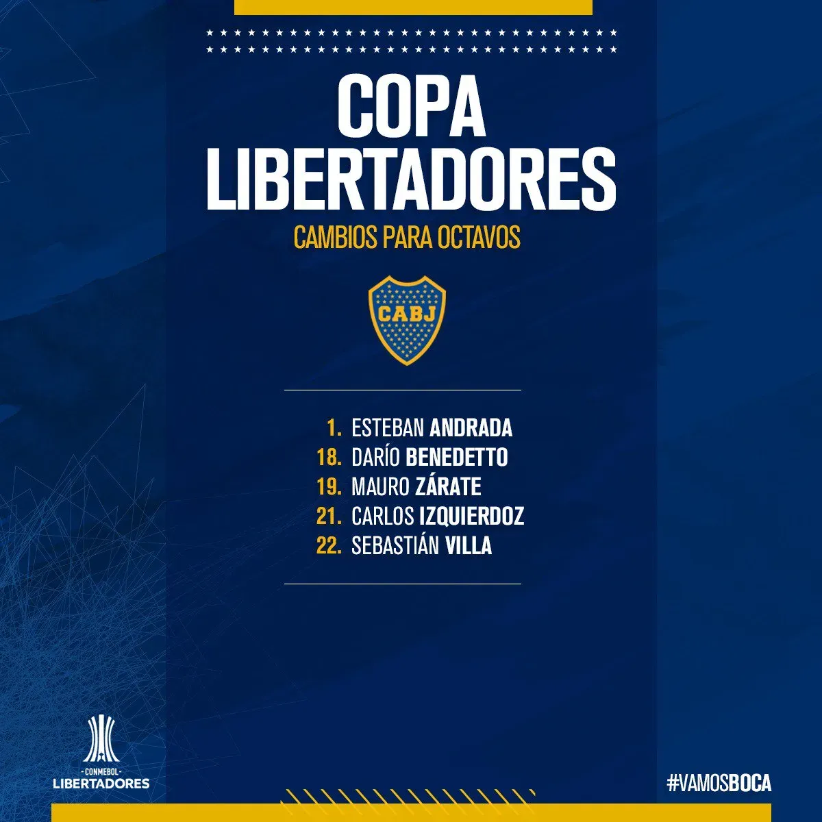 El resto de los nombres ya están confirmados. Quienes completarán la lista son: Esteban Andrada, Carlos Izquierdoz —deben incluirlo para que se cumpla la sanción—, Sebastián Villa y Mauro Zárate. De esta manera, se queda afuera Lucas Olaza; único reemplazo de Emmanuel Mas.