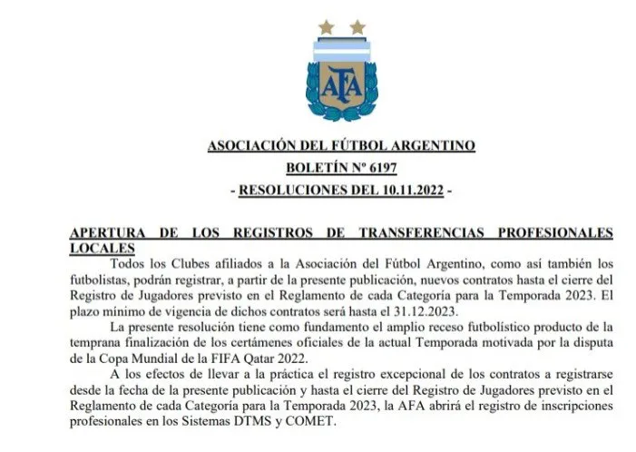 Así, se abrió un nuevo libro de pases en Argentina. Además, en el comunicado, AFA aclaró que el plazo mínimo de vigencia del contrato del futbolista adquirido tendrá que ser obligatoriamente hasta el 31/12/23. Es decir, con un mínimo de un año de contrato.