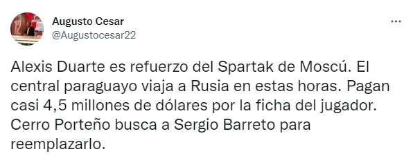 Desde que inició el periodo para realizar transferencias, sonaron muchísimos nombres para llegar al club, pero las negociaciones se fueron cayendo poco a poco. Sabiendo que contaban con cupos de extranjeros, uno de los últimos esfuerzos fue por Alexis Duarte, zaguero que viste la camiseta de Cerro Porteño.