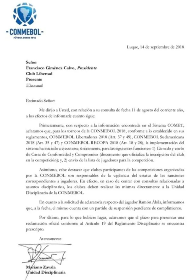 CONMEBOL respondió a Libertad informándole que Ábila tiene una fecha más. De esta manera, si el equipo paraguayo hubiera hecho una denuncia 24 horas después de la ida, hubiera clasificado. Una locura.