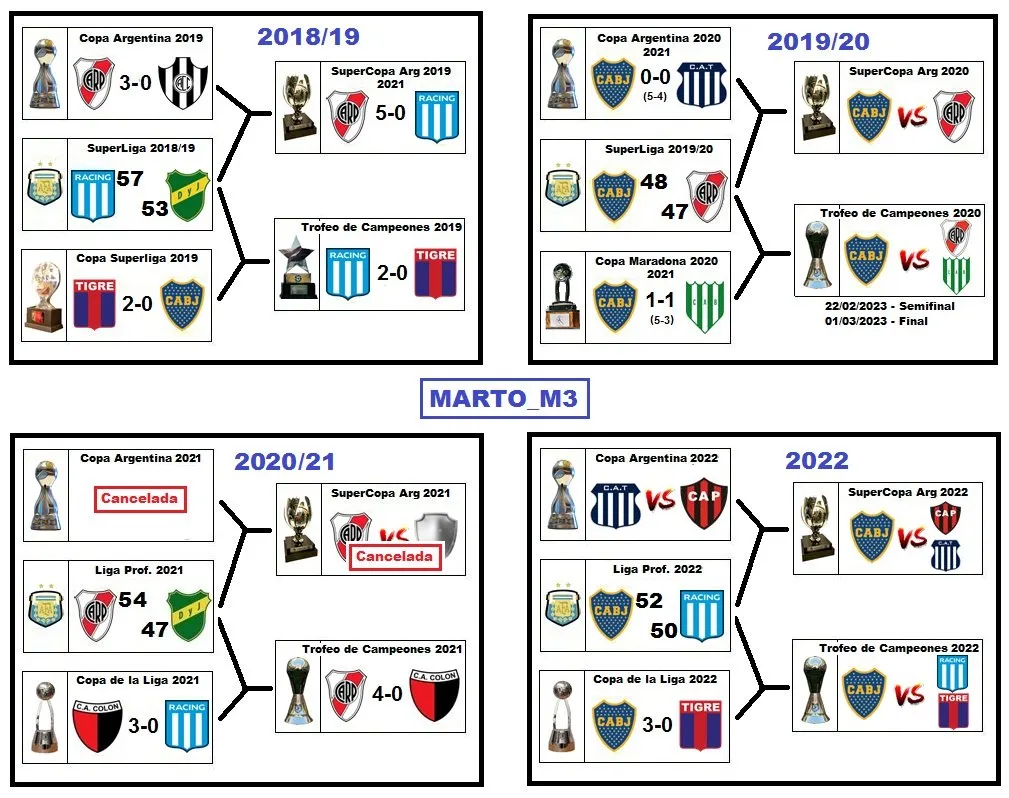 Además, están pendientes la Supercopa Argentina 2020 frente a River y la Supercopa Argentina 2022 vs. Patronato. Esta última se llevará a cabo en Abu Dhabi, Emiratos Árbes, durante enero del 2023 (todavía no se confirmó el día específico).