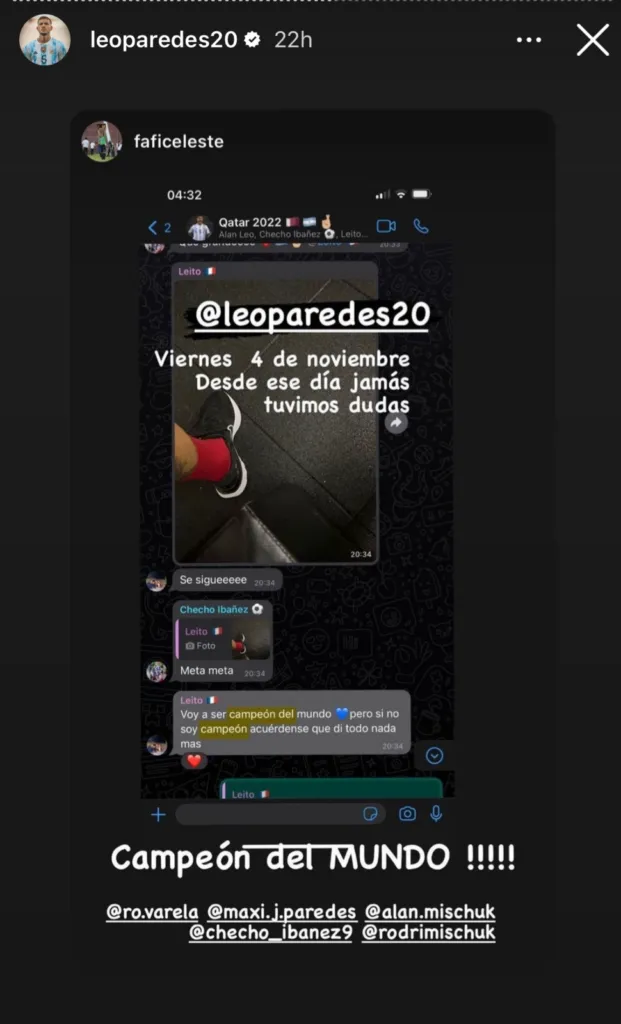 En una historia en Instagram, Francesco Celeste, que supo jugar en Boca hace unos años, compartió un mensaje que el mediocampista envió al grupo de Whatsapp el 4 de noviembre. “Voy a ser campeón del mundo, pero si no soy campeón acuérdense que di todo. Nada más”, contó el futbolista de Juventus.