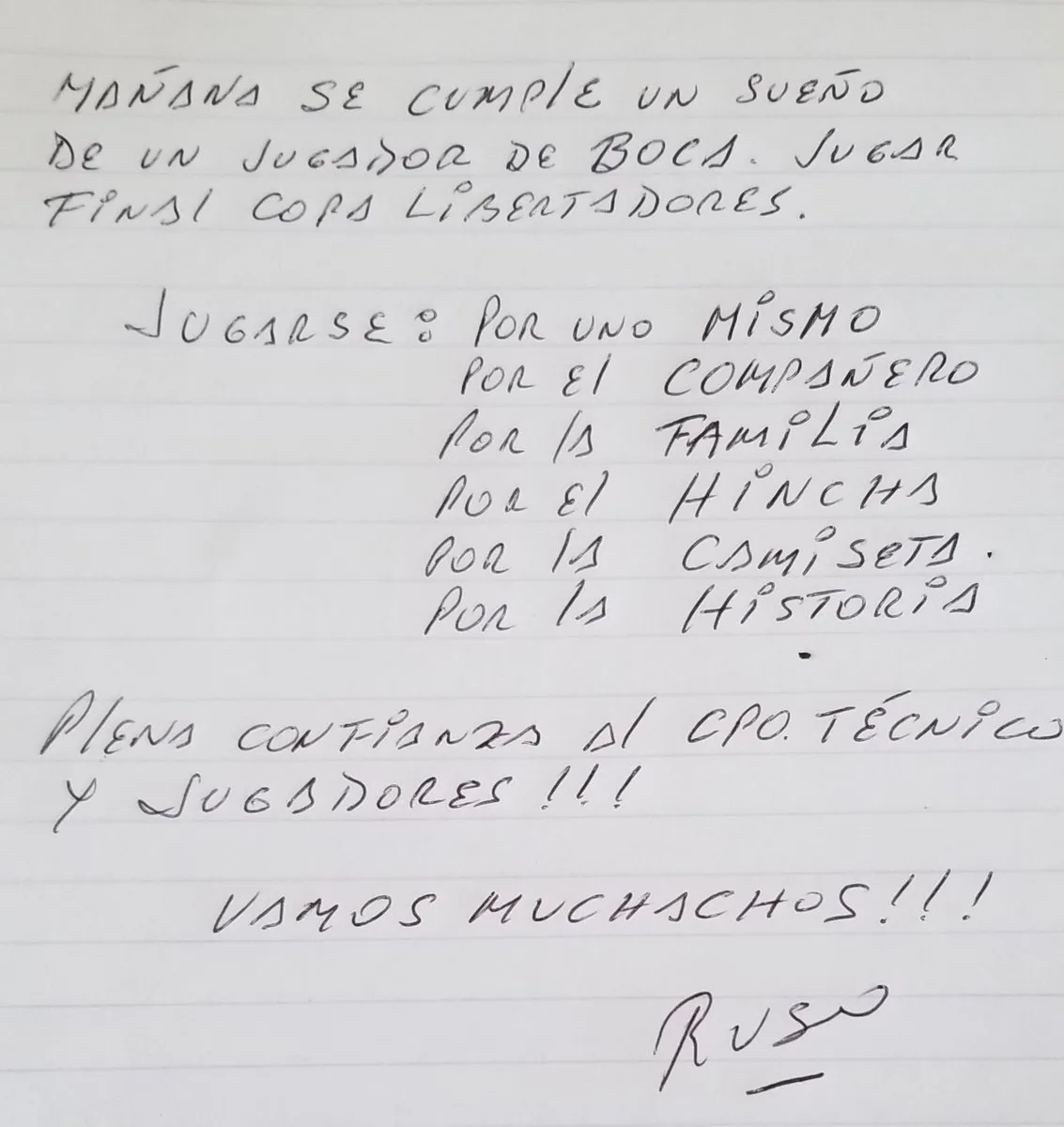 El autor se llama Jorge Ribolzi. Sí, el mismo que supo dar la vuelta en 1976 ante el Millonario, ganar la Libertadores y obtener la Intercontinental. Dicen que la mística es algo que se lleva adentro, por eso el Ruso expresó sus sentimientos y transmitió buenas vibras.