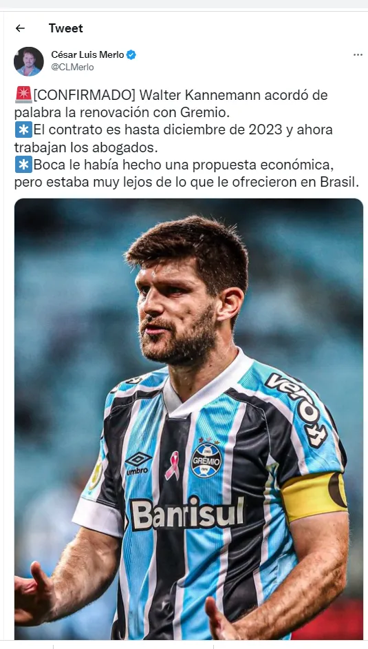 Hace algunos días, el periodista César Luis Merlo reveló que Boca le hizo un ofrecimiento formal a Walter Kannemann, defensor central de 31 años que milita en el Gremio de Brasil. El Xeneize quería que se sumara como jugador libre a partir del mes de enero y le ofreció un contrato por dos o tres temporadas.