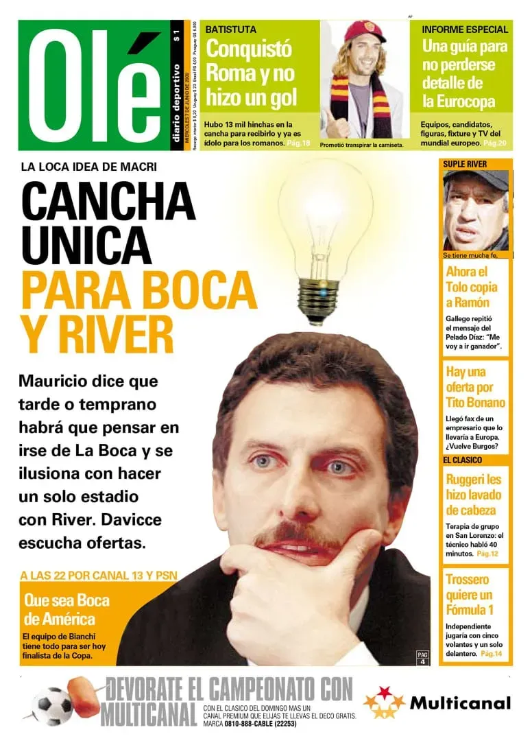 Hay un antecedente interesante. En 2006, Macri, por entonces presidente de Boca, manifestó: “Yo sigo fantaseando con hacer junto a River un estadio único, más moderno y con mayor cercanía, para no alejar al espectador”.