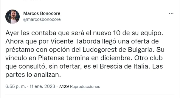 Según contó el periodista Marcos Bonocore, a Boca ya llegó una oferta formal para quedarse con los servicios del enganche que está cedido en Platense pero que tiene vínculo con el club hasta diciembre del 2026.