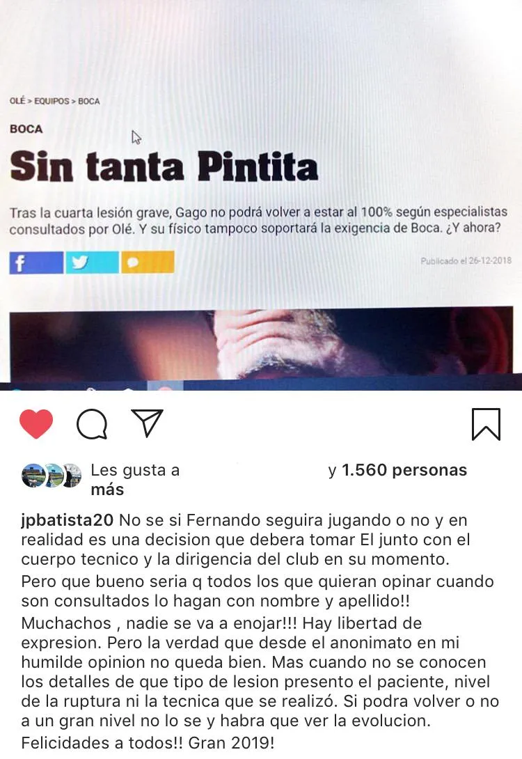 “No se si Fernando seguirá jugando o no y en realidad es una decisión que deberá tomar él junto con el cuerpo técnico y la dirigencia del club en su momento. Pero que bueno seria que todos los que quieran opinar cuando son consultados lo hagan con nombre y apellido. Muchachos, nadie se va a enojar!!! Hay libertad de expresión. Pero la verdad que desde el anonimato en mi humilde opinión no queda bien. Más cuando no se conocen los detalles de qué tipo de lesión presentó el paciente, nivel de la ruptura ni la técnica que se realizó. Si podrá volver o no a un gran nivel no lo sé y habrá que ver la evolución. Felicidades a todos!! Gran 2019!!”